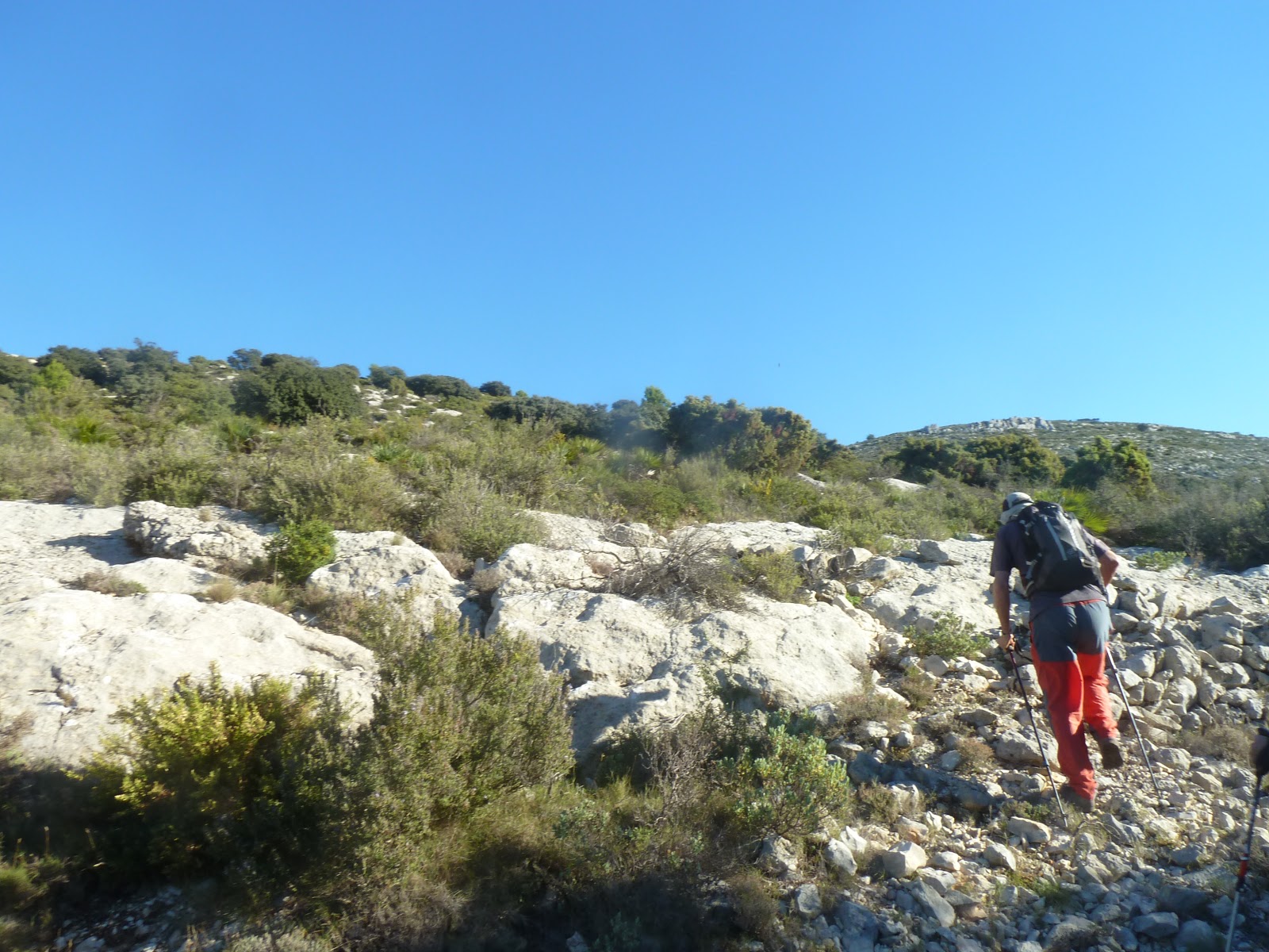 Después de un largo recorrido por estas cornisas llegamos a una pista ancha que termina en un pequeño tosal. Este se rodea y nos encontramos una pista de cemento que desciende en dirección a Benigembla.